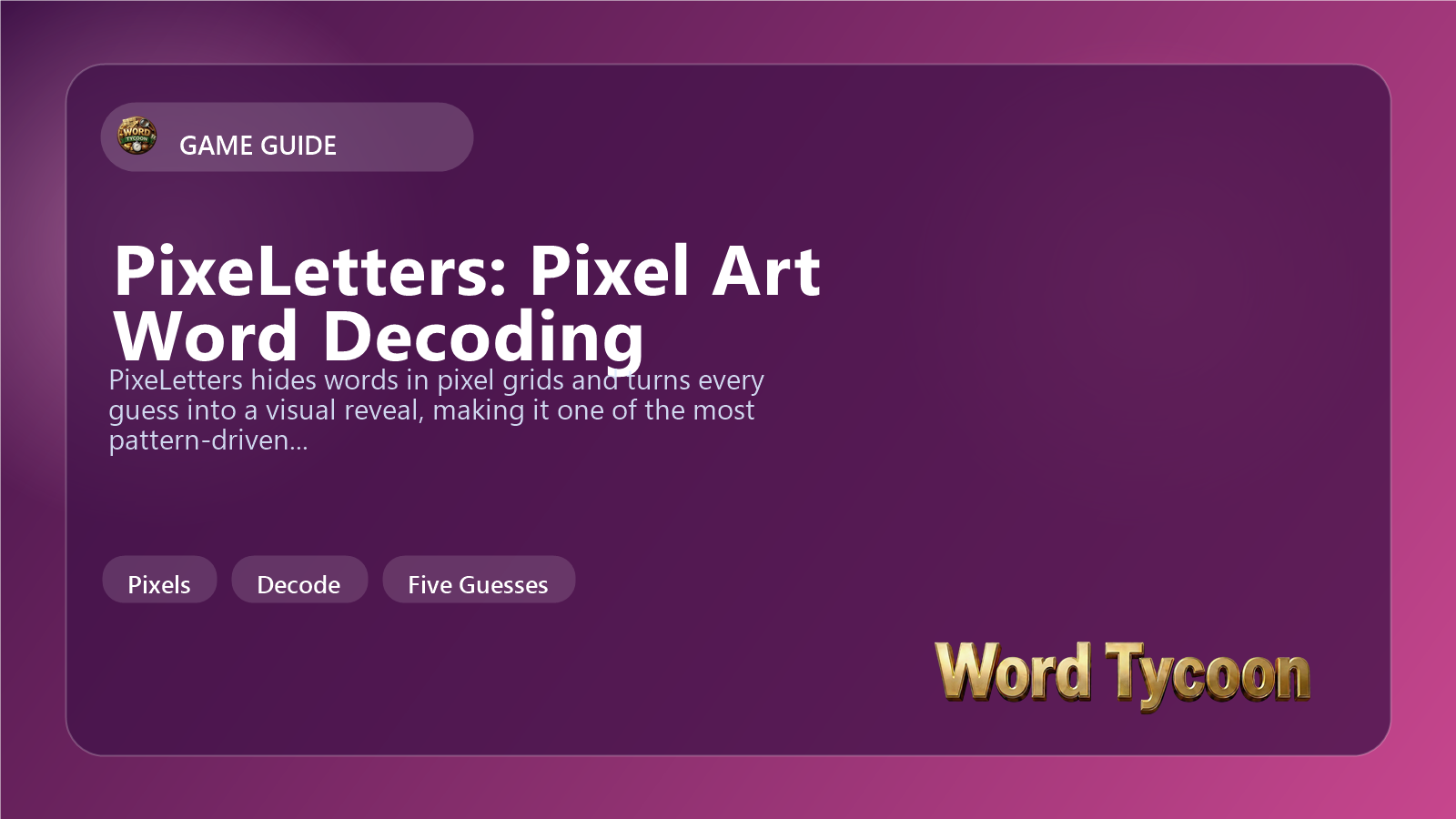 Most of the Word Tycoon catalog is built around language logic, sequence logic, or spatial search. PixeLetters adds visual decoding pressure instead. It is still about a word, but the route to the answer is pattern recognition. That makes it a good complement to the rest of the arcade because it asks the player to see the answer before they can cleanly spell it.